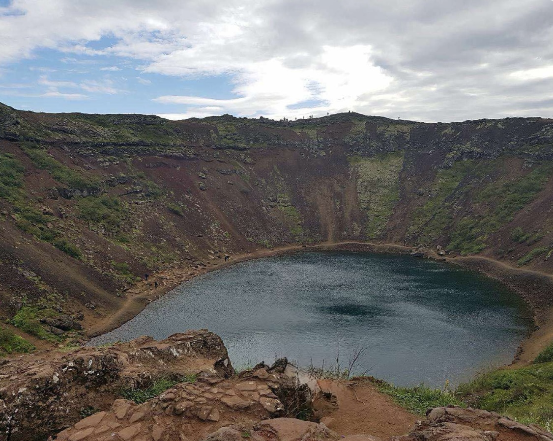 凯瑞斯火山口湖(Kerið Crater) – 独特的地质景观,壮观的火山口湖泊,景色绝美!凯瑞斯火山形成于大约6500年前,直径约 270 米,深约 55 米,湖水深度约 7-14 米(因降水量变化)。火山口的岩壁由红色和橙色火山岩构成,和冰岛常见的黑色玄武岩不同,形成鲜明对比。 湖水呈现碧蓝或翠绿色,在阳光下更加梦幻。Kerið 并非喷发后形成的典型火山口,而是火山活动逐渐耗尽岩浆,最终塌陷形成的湖泊。游客可以沿着火山口边缘步行一圈,俯瞰整个湖泊,欣赏壮丽的全景。也可以走下火山口,近距离观赏湖水和火山岩壁。